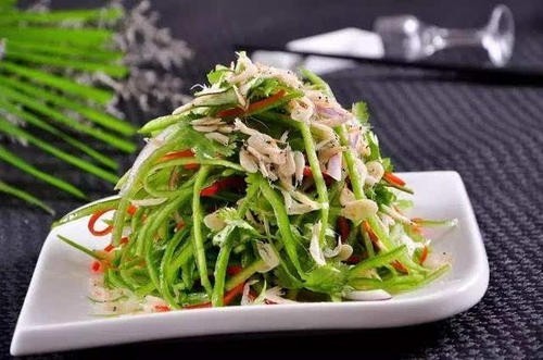 用料:辣椒(青、尖)(100克)、黄瓜(100克)、香菜(50克) 、大葱(50克)、香油(15克) 、酱油(5克)、 盐(3克)、 味精(2克)。