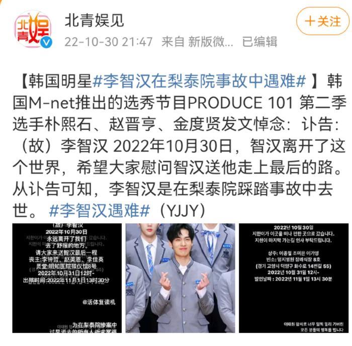24岁男星李智汉在梨泰院遇难,因韩版《101》出道,权志龙大S发声