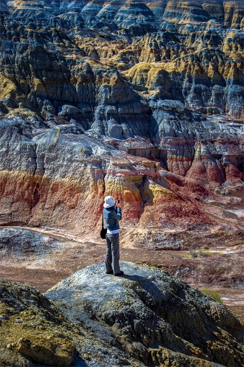 奇妙景观:色彩变幻由深红、黄、橙、绿等多种色彩的泥、页岩互层构成低丘群,方圆约3平方千米 。色彩随时间和光照变化,早晨清新淡雅,中午炽热淡化,黄昏绚丽多彩 。