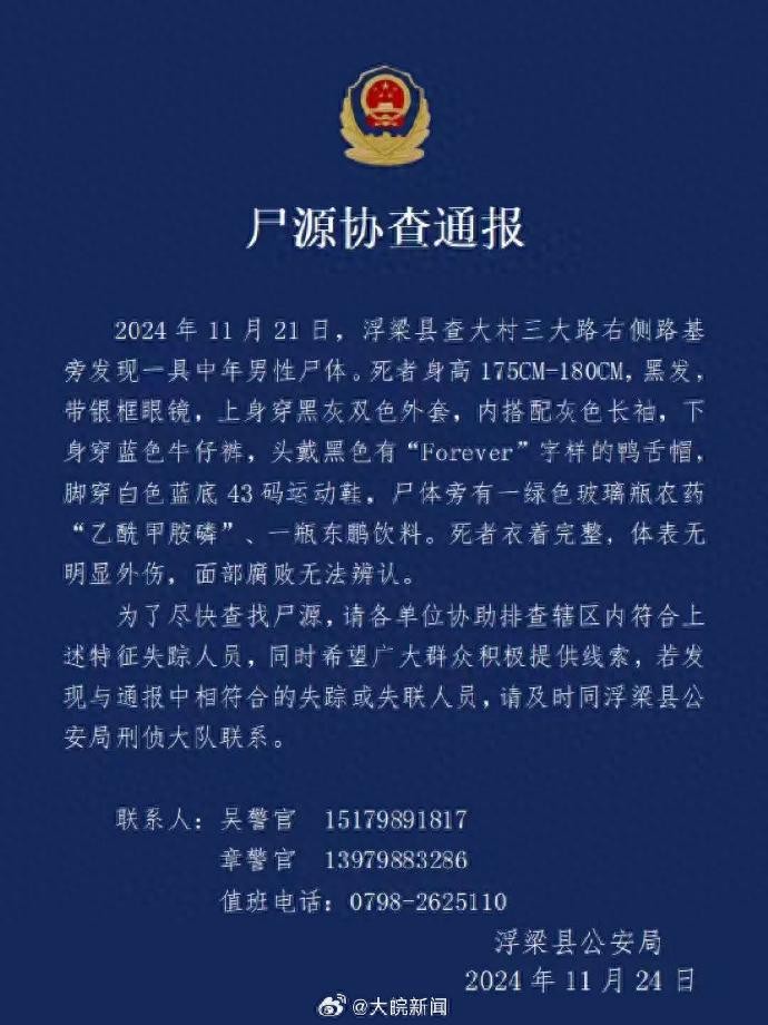 2024年11月21日,浮梁县查大村三大路右侧路基旁发现一具中年男性尸体。死者身高175CM-180CM,黑发,带银框眼镜,上身穿黑灰双色外套,内搭配灰色长袖,下身穿蓝色牛仔裤,头戴黑色有“Forever”字样的鸭舌帽,脚穿白色蓝底43码运动鞋,尸体旁有一绿色玻璃瓶农药“乙酰甲胺磷”、一瓶东鹏饮料。死者衣着完整,体表无明显外伤,面部腐败无法辨认。