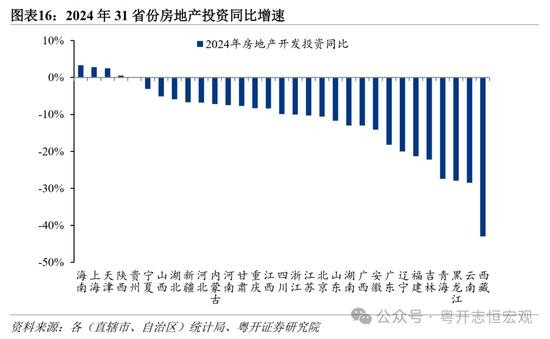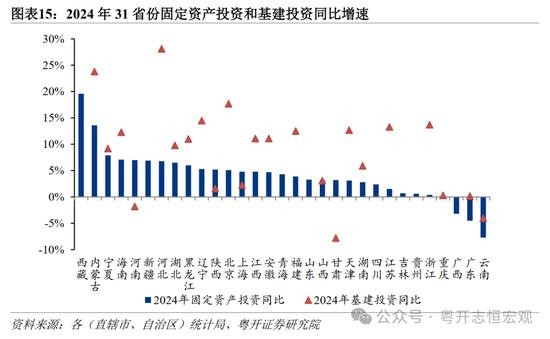 从投资看,多数省份制造业投资和基建投资景气,房地产投资处于探底期。2024年,全国固定资产投资保持平稳增长,分领域看,制造投资保持高景气度,房地产投资依然低迷,基建投资结构分化,中央财政主导的水利投资高增长、地方主导的交通投资承压。从2024年目标完成情况看,受益于“两重”政府投资发力、民间投资信心回暖,西藏、宁夏、河南、河北、江西等固投增速高于全国,且完成了预期目标。分区域看,东北、东部、中部和西部地区投资分别增长4.2%、1.3%、5.0%和2.4%。中部地区高技术制造业、装备制造业投资快速增长,河南、湖北、安徽、湖南制造业投资分别增长24.7%、15.4%、13.3%、9.5%;四省民间投资分别增长10.5%、3.0%、1.7%、4.0%,表现均好于上年。分省份看,全国有28个省份固定资产投资正增长,20个省份投资增速跑赢全国水平,西藏、内蒙古固投增速连续两年占据全国前两位,受基建投资增长带动明显,内蒙古基建投资占全部投资的比重超40%。华南、西南地区一些省份投资增速缓慢,云南、广东、广西三省份投资负增长,分别下降7.7%、4.5%、3.2%;重庆、贵州投资仅增长0.1%、0.4%。一是由于房地产投资下滑,广东房地产开发投资下降18.2%,拖累投资增长超5个百分点。二是高风险省份地方财政优先化解债务风险,地方财政主导的投资被动压缩。2024年,甘肃固定资产投资按项目单位隶属关系划分,中央投资上升47.2%,而地方投资下降2.2%;云南基建投资下降4.0%,其中交通投资下降13.0%。