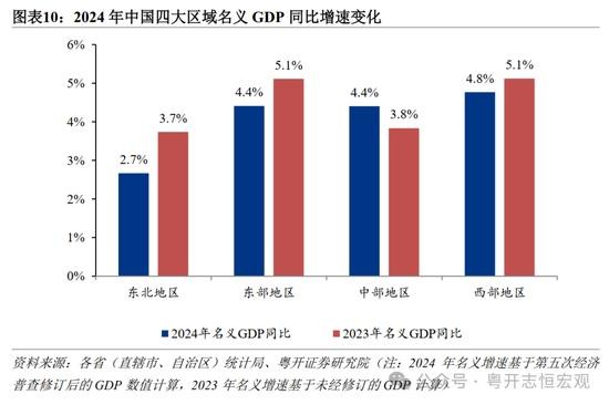 2024年,中国区域经济增长“西快东慢”,西部地区领先,中部地区提速,东部地区遇阻。从实际增速看,2024年实际GDP增速前十名中,西部省份占6席,东部省份占2席,中部省份占2席。从名义增速看,前十名中,西部省份占6席,东部和中部省份分占3席、1席。2024年,东北、东部、中部和西部地区名义GDP同比分别增长2.7%、4.4%、4.4%、4.8%。总体上,各大区域经济增速接近,西部地区经济增速相对更高,一是由于多数省份经济体量小、潜力大;二是受到产业转移、绿色转型、扩大开放的三重利好驱动,加快将能源优势向产业优势转化,打造经济新增长点。中部地区经历2023年经济调整期之后迅速修复,受益于区域重大战略,产业协同创新推进,2024年名义GDP增速加快0.6个百分点。长江中游城市群成为区域增长极,湖北2024年名义GDP增长5.7%,排名全国第二。东部地区增长放缓、区域分化,长三角城市整体表现好于珠三角。东部地区2024年名义GDP增速放慢0.7个百分点,不同城市面临产业结构调整、房地产市场探底、消费意愿低迷等多重阻力。长三角城市群26市GDP加权平均增长5.5%,超过全国平均水平;而珠三角九市加权平均增长3.7%,低于全国与长三角平均增速。由于不同城市产业结构与房地产市场调整节奏不同,广佛肇等珠三角城市仍处于产业转型阵痛期和房地产调整消化期。东北地区经济仍处于“漫长的季节”,受制于人口外流、产业竞争力下降等因素,辽宁、吉林、黑龙江名义GDP分别增长3.9%、3.0%、0.0%,远低于全国平均水平。