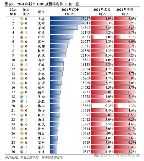 从城市排名看,上海领跑全国、重庆超越广州、宁波超越天津,唐山跻身万亿城市行列。2024年,长三角城市群经济增长强劲,上海GDP继续位列全国城市榜首,按美元平均汇率折合7572亿美元,人均GDP首次超过3万美元;在同一级行政区比较上,上海市GDP相当于日本东京都(8303亿美元 )的九成左右。深圳GDP增速在一线城市中最快,GDP规模继续维持全国第三位,深圳外贸进出口规模则升至全国城市榜首。然而,珠三角其他城市则经济表现欠佳:2024年广州经济增长弱于预期,受到房地产和传统汽车行业的双重拖累,GDP排名下降至全国第五;佛山制造业竞争力下降,GDP增速在万亿元城市中垫底,GDP排名被合肥和济南超越;东莞经济受房地产拖累,GDP排名被南通超越。重庆GDP超过广州、跻身全国第四城,主要得益于新能源汽车产业引领工业升级,加快形成发展新动能。宁波GDP排名超越天津,背后是南北方第一大港口内外需表现分化,宁波2024年进出口增速(11.1%)高于天津(1.3%),宁波社会消费品零售额增速(1.3%)高于天津(-3.1%)。2024年,“万亿城市”队伍继续扩容,唐山成为中国第27座万亿GDP城市,这不仅源于唐山利用中央增量政策加快释放消费需求,开展消费品以旧换新进社区、进农村等活动,还通过钢铁工业转型促进工业投资,加强钢企融资、“两新”再贷款支持,叠加GDP修订因素,2024年名义GDP突破万亿元关口。