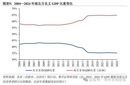 近五年南北省份GDP占比保持相对稳定,“南升北降”主要发生在2013-2019年,其后南北占比大体稳定,2024年南方经济占比略上升0.1个百分点至64.8%。中国南北经济格局,很大程度上受到新兴产业与传统产业竞争力影响,背后是市场化程度和营商环境的差异。南方有新质生产力支持但同时面临房地产冲击,北方有资源和“一带一路”出口优势但遭遇物价冲击。新时代以来,受经济结构转型和供给侧改革去产能影响,以及南北方市场化程度的差异,东北一些资源枯竭地区去工业化,加之辽宁、天津等省份统计数据“挤水分”,导致“南升北降”加速演进,北方省份GDP比重从2012年42.9%降至2019年的35.4%。2020年以来,双循环新发展格局加快构建,南北GDP比重变化相对较小。2022年,受益于百年变局下全球供应链受阻、能源安全重要性上升,大宗商品量价齐升,北方资源型大省名义GDP高增长,一度扭转了“南升北降”格局。