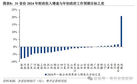从目标完成情况看,四分之三的省份2024年未能完成GDP增长预期目标。2024年,仅有8个省份GDP增长完成年初预期目标,主要是华东地区经济大省,源于这些省份地方政府目标相对务实、工作更加进取。江苏、山东GDP分别增长5.8%、5.7%,分别超过预期目标0.8个、0.7个百分点,浙江、上海、福建实际增速与目标持平。2024年,全国有23个省份GDP增长未能完成目标,9个省份GDP实际增速与目标相差1个百分点以上。海南GDP预期目标最高,与GDP实际增速的差距最大,相差4.3个百分点。广东GDP增速低于目标1.5个百分点,连续两年未能完成GDP 增长预期目标,与房地产市场持续下行有关。部分化债重点省份经济增速与目标差距较大,与房地产投资下行、当地基建投资受到约束有关,黑龙江、青海、吉林、云南分别低于目标2.3个、2.3个、1.7个、1.7个百分点。西藏、新疆虽然实际增速领先于全国,但与地方政府设定的目标(8.0%、6.5%)仍有一定差距。上述2024年未完成目标的省份中,多数在2025年下调了GDP预期目标,有利于更加务实的推进稳增长任务。