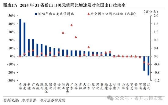 从外需看,东部和西部地区出口增长较快,外贸大省出口表现好转。2024年面临的国际环境更加复杂严峻,美欧关税威胁加大,我国不断提升外贸产业竞争力,促进新业态新模式发展,巩固外贸外资基本盘。从外贸看,全国出口金额美元值增长5.9%,25个省份出口额美元值同比正增长。分区域看,东北、东部、中部和西部地区出口同比分别增长6.9%、6.5%、-3.2%和9.9%,西部省份出口增速高于全国平均水平4.0个百分点。青海出口额增长45.7%,增速排名全国第一,源于新能源材料、农产品出口亮眼;新疆、西藏出口两位数高增长,源于口岸贸易发展加快,对“一带一路”地区的双向开放不断扩大。东部外贸大省出口较快增长,民营企业发挥稳外贸作用,广东、浙江、江苏出口扭转了上年下滑的势头,分别拉动全国出口增速1.5个、1.2个、1.0个百分点。中部省份出口跌幅有所收窄,安徽汽车出口表现抢眼,全国每出口4辆汽车就有1辆“安徽造”;湖南、江西出口大幅下滑,与劳动密集型产品出口萎缩有关。从外资看,外资大省新增吸收外资规模下降。2024年全国实际使用外资同比下降27.9%,制造业和服务业外资分别下降30.4%、24.7%。外资大省稳外资压力较大,吸引增量外资的难度上升,转而支持外资利润再投资。广东、山东、上海、浙江实际使用外资美元值分别下降37.1%、32.6%、26.6%、24.5%,上海科研和技术服务业吸收外资下滑较多。