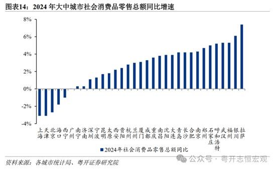 从消费看,居民消费需求仍有待提振,高能级城市消费表现不及低能级城市。2024年是商务部确定的“消费促进年”,各地利用财政资金支持消费品以旧换新。分类别看,限额以上单位零售额中,家电、家具、办公用品、通讯器材类商品消费高增长,而受汽车价格战影响汽车类消费同比仅增0.8%。与2024年地方政府工作预期目标相比,大多数省份未能实现社零增长目标,消费对经济增长的贡献仍有待提升。2024年,全国最终消费支出对GDP增长贡献率44.5%,低于2022年的49.3%,处于近二十年的较低水平。居民收入增长预期走弱是制约消费重要原因,2024年,全国29个省份城乡人均可支配收入同比增速较2023年有不同程度放缓,上海人均可支配收入增长4.2%,低于2023年2.4个百分点。分区域看,中部地区消费增长相对较快。东北、东部、中部和西部地区社会消费品零售总额分别增长3.3%、2.6%、5.1%和3.7%。分省份看,26个省份社零同比正增长。西藏、河南、河北、湖南、湖北社零分别同比增长7.2%、6.1%、5.5%、5.4%、5.1%,增速分列全国前五位;海南社零同比-4.2%,增速最低。分城市看,低能级城市消费表现好于高能级城市。一线城市中,上海、北京社零负增长,广州基本持平,深圳增长1.1%,与汽车消费、餐饮服务消费增长乏力有关;与之形成鲜明对比的是,福州、武汉、石家庄等二线城市社零增长都在5.0%以上,南京、合肥、长沙社零增长超4.0%。