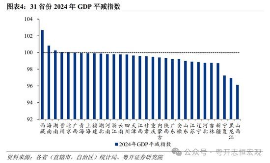 从省份排名看,经济大省GDP排名基本不变,内蒙古进入全国前20名。第五次经济普查对GDP核算方法和结果进行了修订,第三产业规模大、住房租金较高的城市GDP向上修订幅度较大,上海、北京2023年GDP分别上修了8.9%、8.2%。上海修订后GDP高于湖南,位居全国第九名;北京修订后GDP高于河北,位居全国第12名。2024年,大多数省份GDP排名与上年保持一致,唯一的变化在于内蒙古排名超过山西。内蒙古2024年抓住“两重”“两新”政策红利扩投资和促消费,推动GDP较快增长,GDP排名回到全国中游进入前20名行列。山西受到经济结构持续调整、煤炭等大宗商品价格波动影响,GDP平减指数较低,GDP排名下滑至第21名。其他经济规模较小的省份排名保持不变,新疆GDP首次突破2万亿元,已经超越中亚第一大国哈萨克斯坦的GDP。