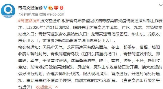 受恶劣天气影响,9日上午8时40分,青岛交通运输官方微博发布最新路况播报:接交警通知,根据青岛市新型冠状病毒感染肺炎疫情防控指挥部工作要求,自2020年1月31日0时起,临时关闭沈海高速牛溪埠、仁兆、九龙、大场收费站出入口;青新高速张舍收费站出入口;龙青高速青岛段团旺、华山东、龙泉收费站出入口;前湾港2号疏港高速灵珠山收费站出入口。