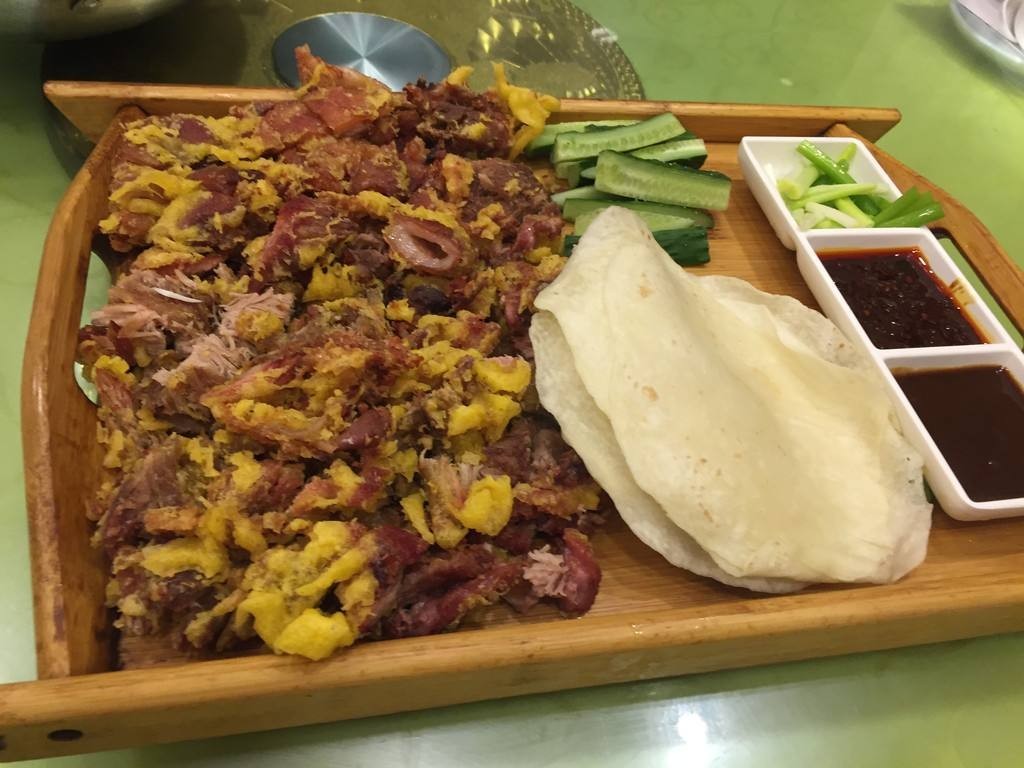这道菜的制作过程和北京烤鸭很相像,都有烙饼、黄瓜丝、蘸料之类的,但味道上可能更胜一筹。
