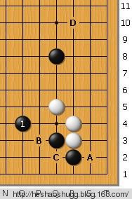图1-10,前图白7在白1粘,虽然免掉了灭顶之灾,但黑4挡舒服,白中央四子舍弃两难。而且黑A、白B、黑C是先手,白如果脱先的话,黑在D位托,白做不出两个眼。