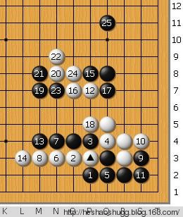 图1-12,在白▲跨的时候,黑1在下面扳,到25形成复杂的战斗,得失与全局的配置有关。其中白12还有变化。