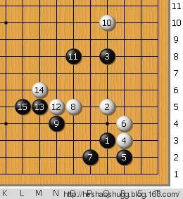图1-15,在白▲拐的时候,黑1单跳好。白2只好穿象眼,到13,局部两分吧。得失要看配置情况。