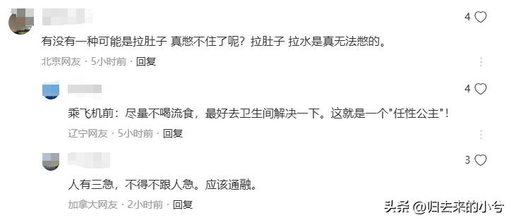 “乘飞机前尽量不喝流食,最好去卫生间解决一下,这就是一个任性公主。”
