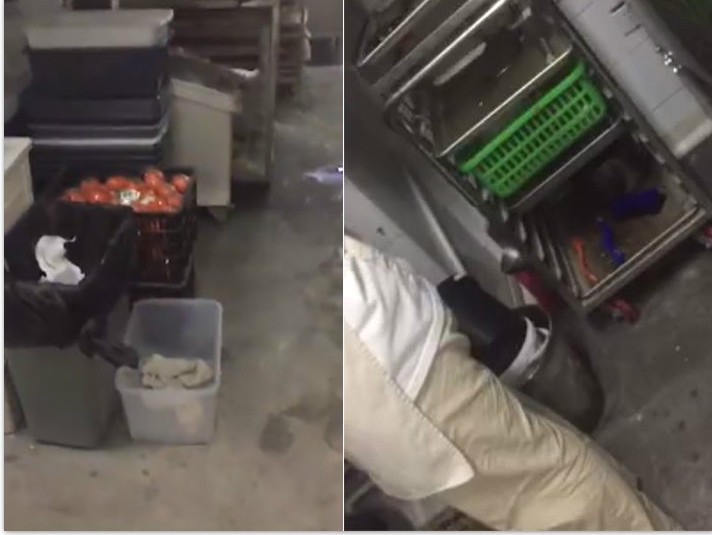 视频还拍摄了后厨脏乱差的场面,一名清洁工在用脏水反复清洗面包模具。