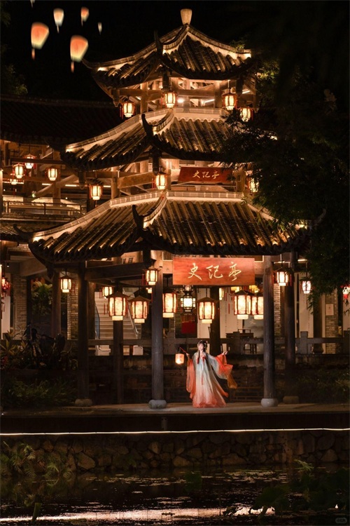 甘坑小镇深处的二十四史书院,美学上复刻了唐宋建筑与中式园林,重现了昔日长安城的盛世景象。 夜晚的二十四史书院,华灯初上,灯火通明,比白日更加引人入胜。换上汉服,穿越时空,感受古人的雅致。