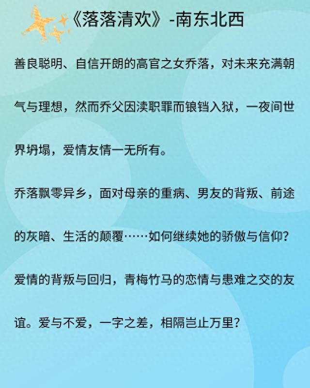 《落落清欢》讲述的是乔落、顾意东、贺迟三人的故事,虽然顾意东从小就爱护乔落,而贺迟从小都是欺负她的,偏偏最心疼乔落的是贺迟。