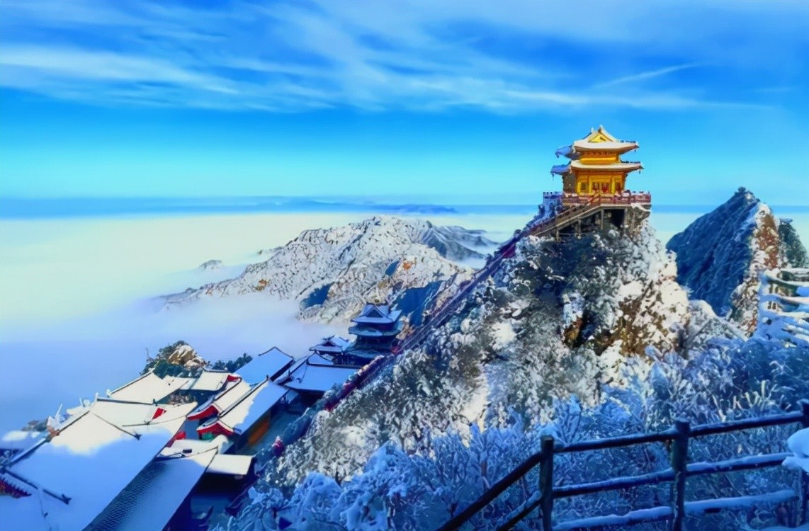 老君山传闻是老子的归隐之地,山上有十几处庙宇,下雪后的庙宇更是表现了道教文化的庄严和神圣。