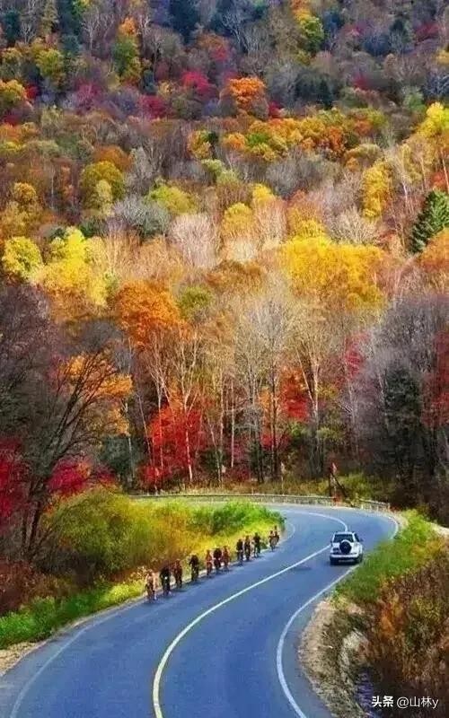 秋色如画,丛林尽染,五彩斑斓,一队骑行者正沿着弯弯曲曲的公路一路走来。