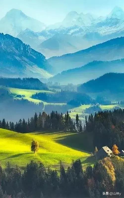 青山绿水,五彩斑斓的树木,绿草如茵的草地,仿佛仙境一般的地方。