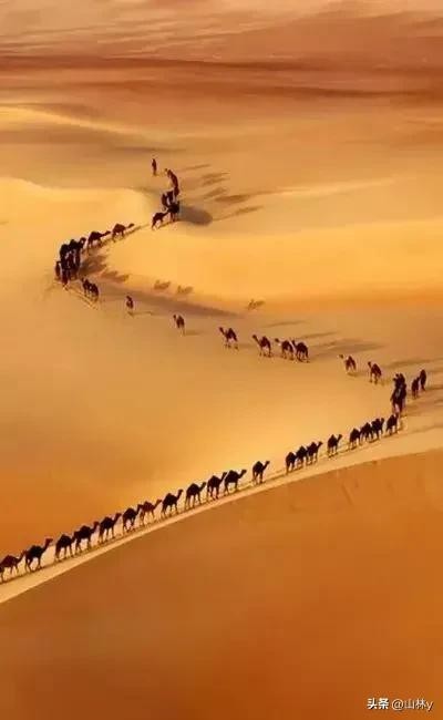 无比壮丽的大沙漠里,一队骆驼正在缓缓前行。