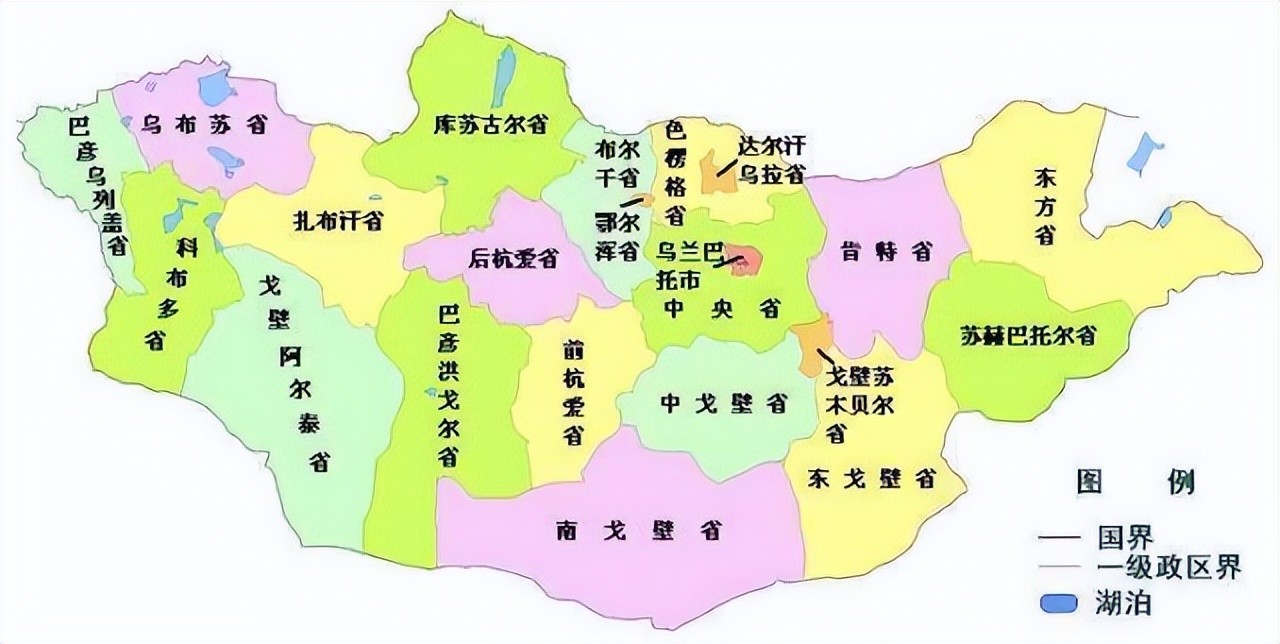 在行政区划上,蒙古国全国分为21个省和首都乌兰巴托。蒙古国最大的省份为南戈壁省,总面积达到了16.5万平方公里,南部和我国接壤。蒙古国第二大省份为戈壁阿尔泰省,总面积约14.1万平方公里,南部和我国接壤。蒙古国第三大省份为东方省,位于蒙古国东部,面积约12.3万平方公里,北部和俄罗斯接壤,东部、南部和我国接壤。