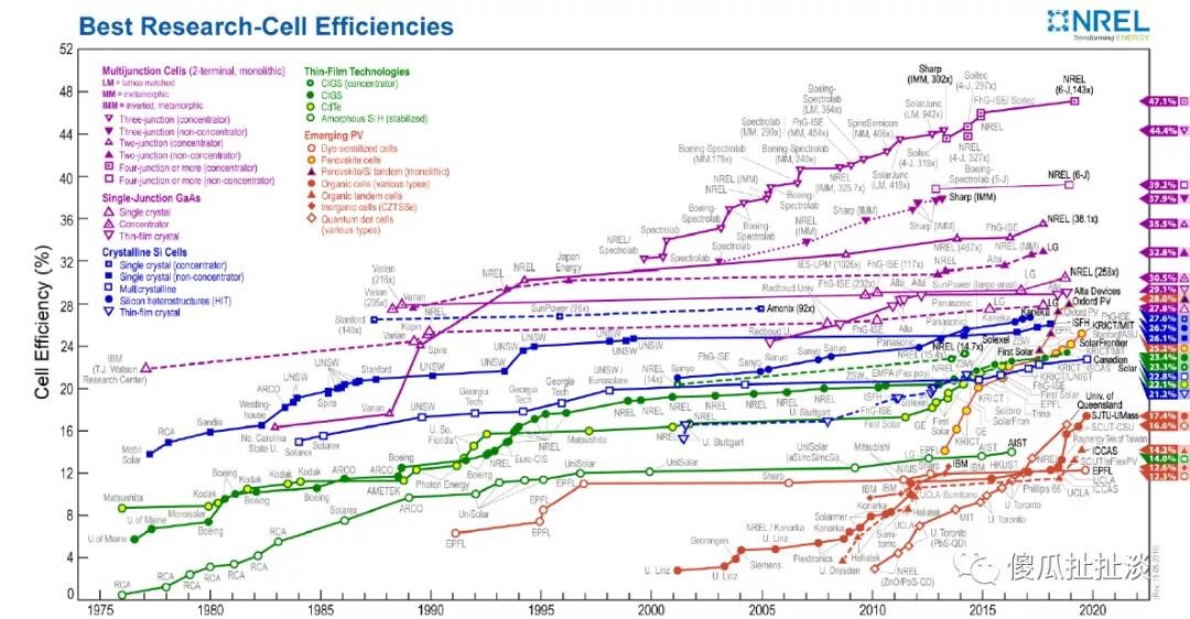 从十年前美国国家实验室的技术演进图来看,光伏的效率排序:异质结(multijunction)>单质结(single-junction)>多晶电池(crystalline si)>薄膜电池(thin-film)。产业层面的两次跳跃间断点完美体现这个效率路线。市场认为光伏新技术层出不穷,难以辨识真伪。根据第一性原理,这个效率路线图是无可争辩的,背后是材料学的科学逻辑。上帝早已安排光伏技术的未来,即异质结技术,独有的复合材料结构以及可观的效率潜力。
