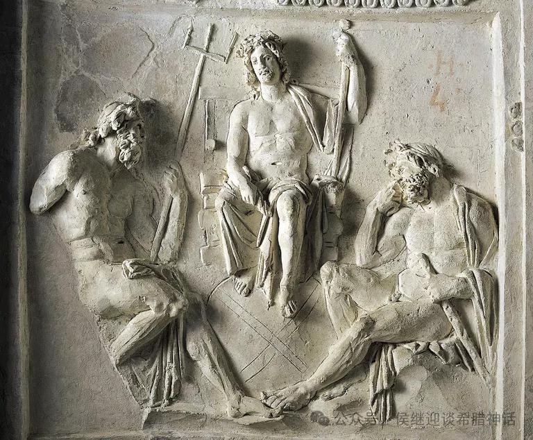 居中者为手持雷霆的宙斯、左侧的波塞冬手持三叉戟、右侧的赫拉克勒斯则拿着他那根标志性的大棒。