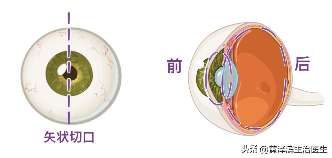 现在,如果你从眼球的矢状切口看,你会发现它的形状就像两个球体融合在一起,一个大球体的在后面,一个小球体的在前面,里面都有液体。