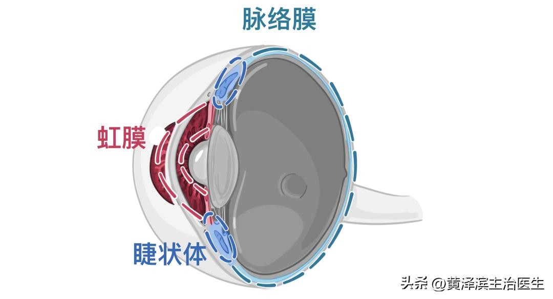 血管层由三部分组成。从后到前依次是:脉络膜、睫状体和虹膜。