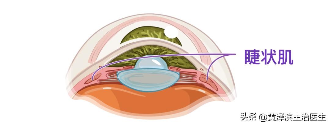 想象一下,这块肌肉就像是一个收缩环,其中较小的晶状体位于环的中心,并通过晶状体的悬韧带在四周与睫状体相连。