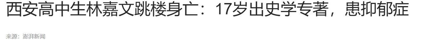 《西安高中生林嘉文跳楼身亡:17岁出史学专著,患抑郁症》