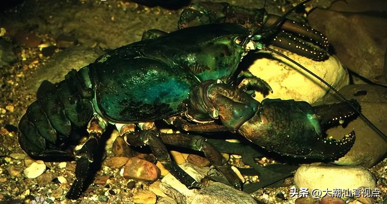 欧洲龙虾,广泛分布在欧洲海岸及英国海岸,体长可达1米,体表颜色是深蓝色参杂浅黄色斑点,腹部为黄色。长有一对巨大的螯,用以切割、击碎猎物。两条触角长而粗壮。