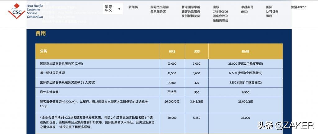 同样,主办方亚太顾客服务协会的官网对参选的费用明码标价:亚太及中国杰出顾客关系服务奖 ( 公司奖项 ) 价格为 23000 元人民币,包括两个颁奖晚宴名额;每一个额外公司奖项为 12500 元,包括一个颁奖晚宴名额;亚太及中国杰出顾客关系服务奖 ( 个人奖项 ) 为 3350 元,包括一个颁奖晚宴名额;实地考察差旅费为 6500 元;顾客服务管理证书 ( CCSM ) ,以履行并遵从中国杰出顾客关系服务奖的评选标准 CSQS,标价则为 26000 元 /2 位。