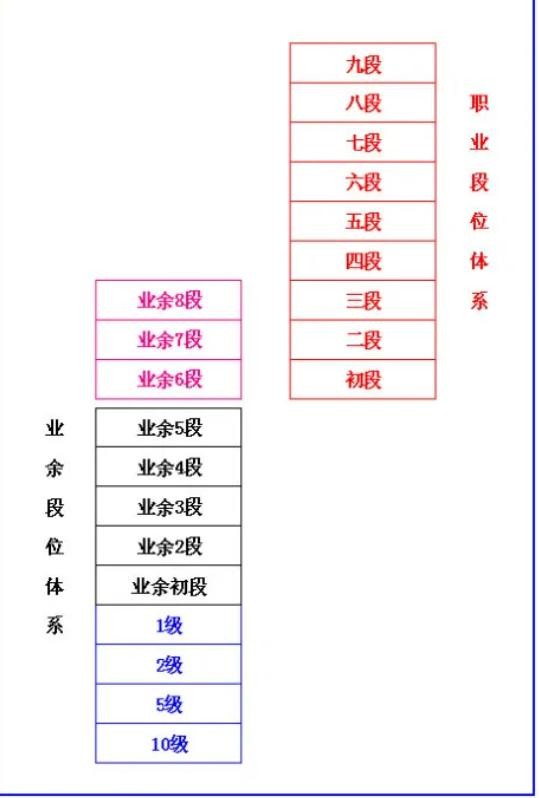 专业段位从低到高依次是专业初段、专业二段、…、专业八段、专业九段。注意:专业段位的标注是汉字。