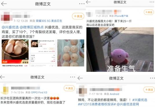 此外,记者发现,也有不少用户在微博平台上吐槽兴盛优选的产品质量以及售后服务问题。
