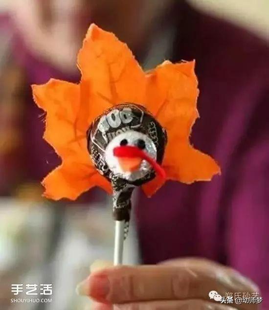 棒棒糖上粘贴一片叶子做成的小鸟。