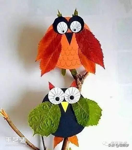 树叶贴出的小鸟和猫头鹰。