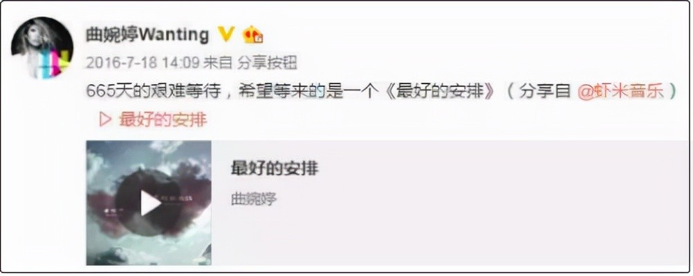 哭也正常。可眼泪还没擦干,她反手就是发了一首新歌《最好的安排》,说:“在艰难等待的665天,希望能等来一个最好的安排。”