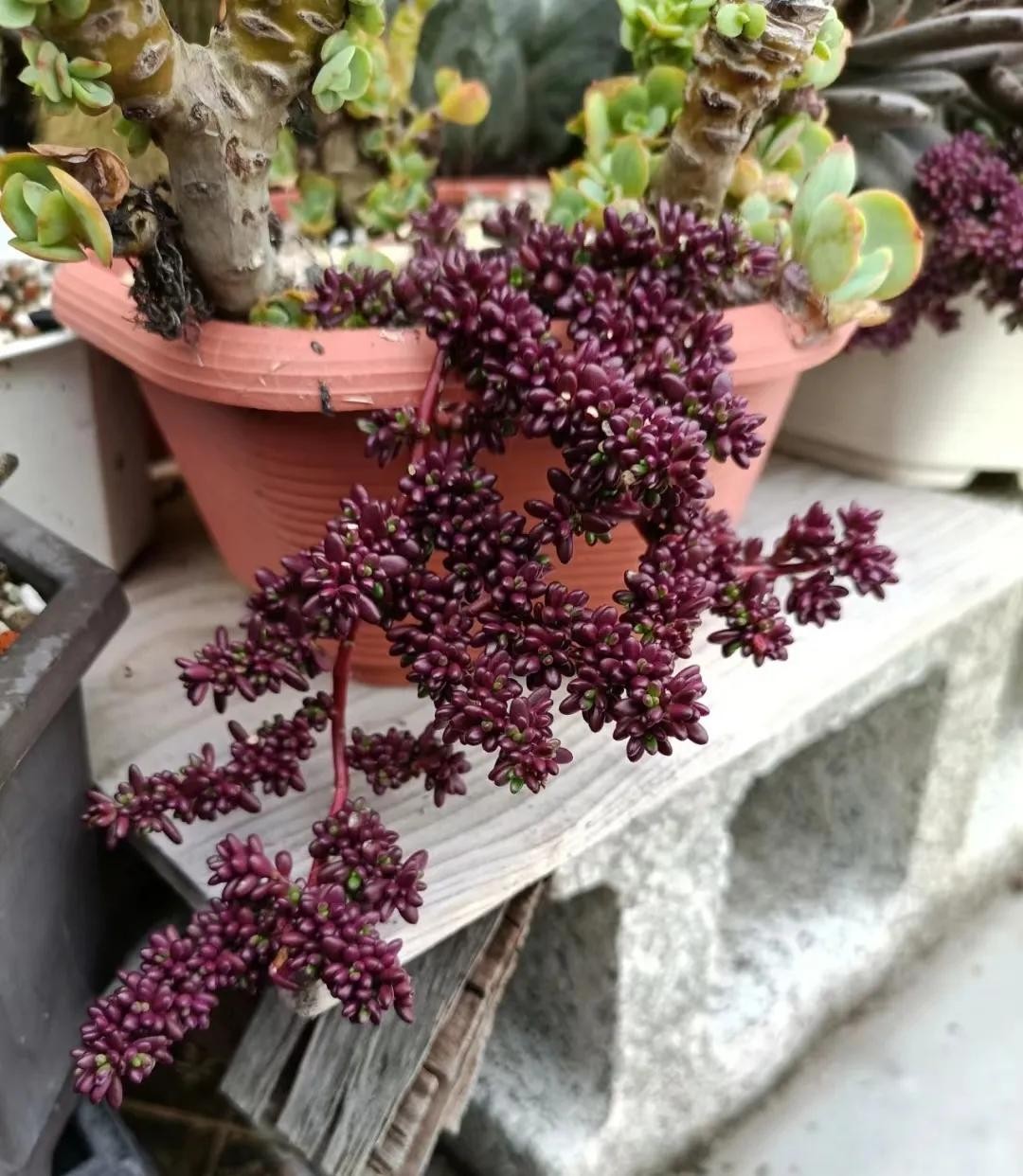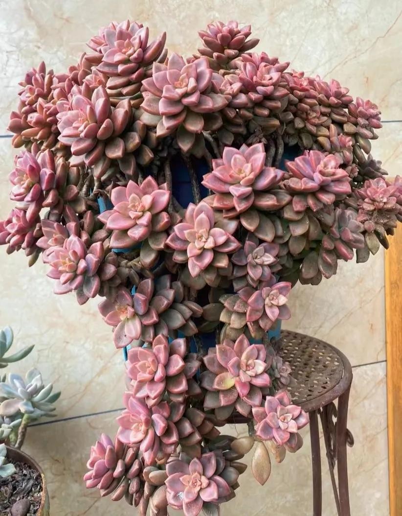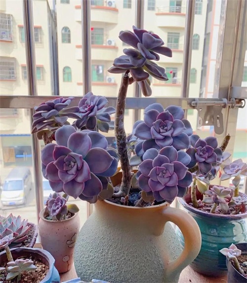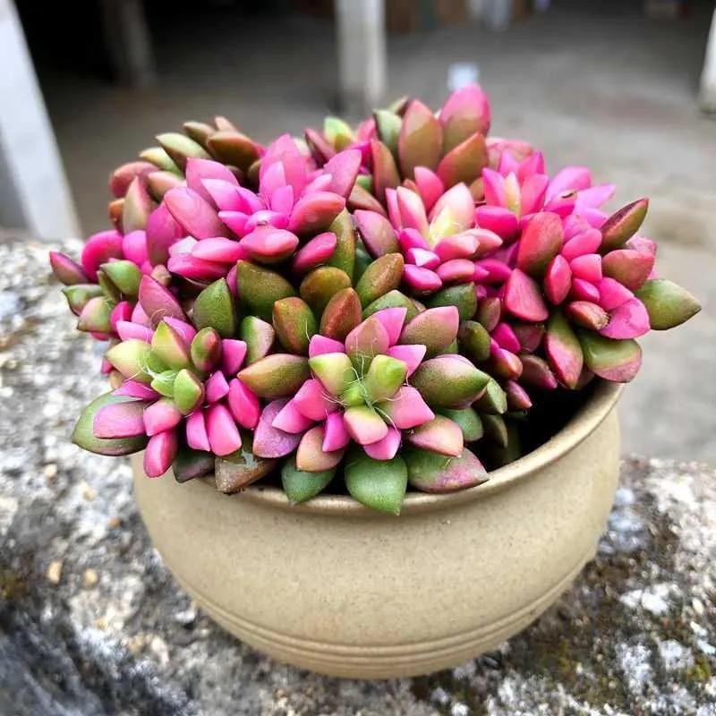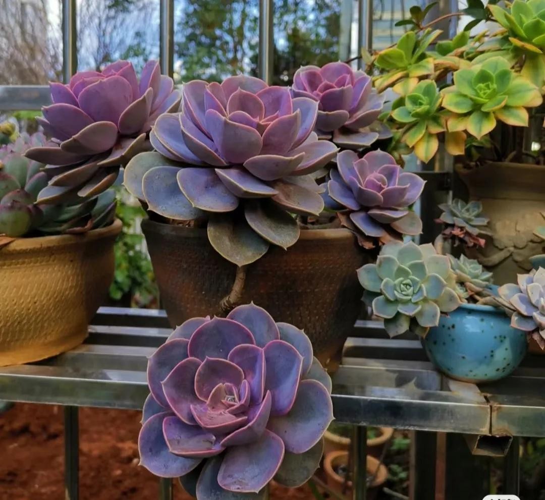 出状态的紫乐,其叶片粉嫩,颜色艳丽,肥厚宽大的叶片,看着有点萌。紫乐在多肉圈内可是出了名的大普货,既好养,又容易出状态,而且还能很好的塑造造型。