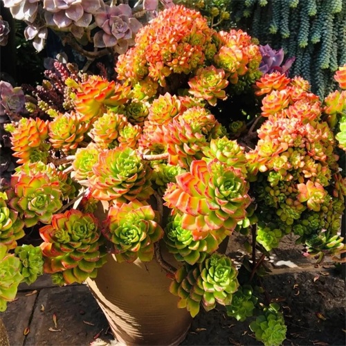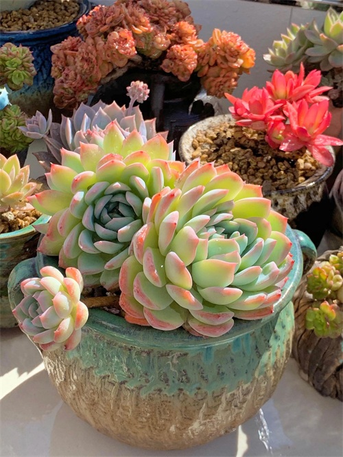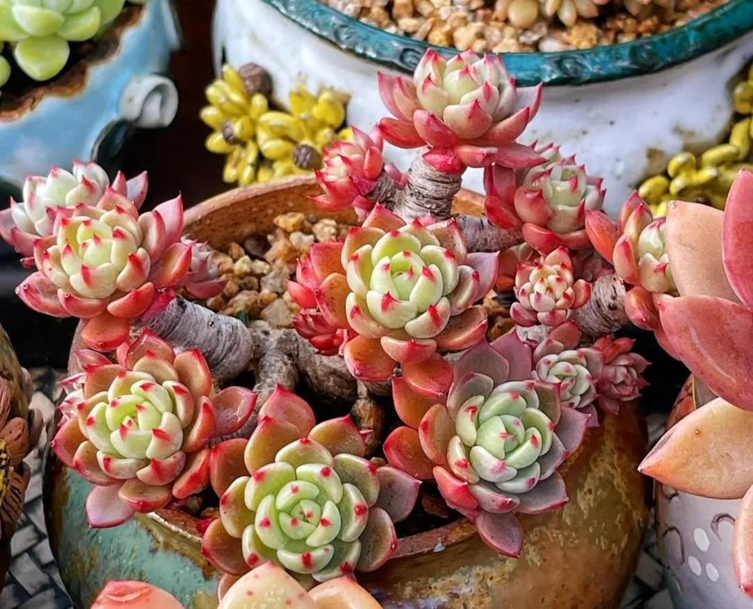 秋丽的叶片较细长,正面平滑微下凹,背面明显突起似龙骨状,顶端稍尖,但整体仍较圆润。春秋冬季节,在充足的光照下叶色很多变,呈现出粉、橙、红、紫、黄等多种颜色。