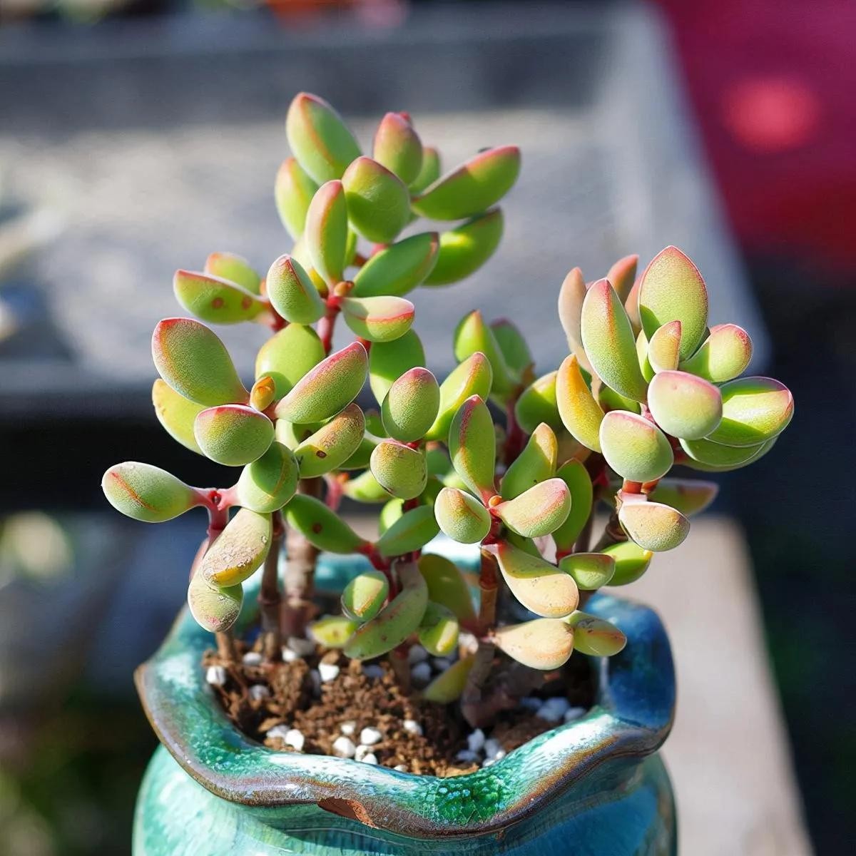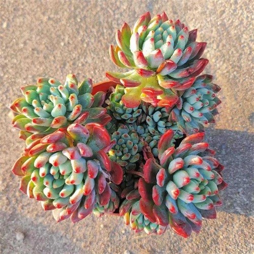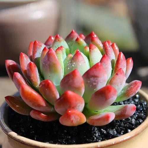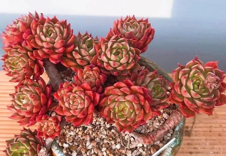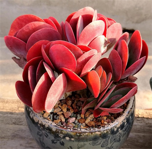 叶片为细长匙状,前端较肥厚、斜尖,呈莲花状紧密排列,整体较包。红宝石叶片非常光滑,因此不管是秋冬季节变红或者夏天变绿的时候,颜色都比较醒目,看上去非常赏心悦目。