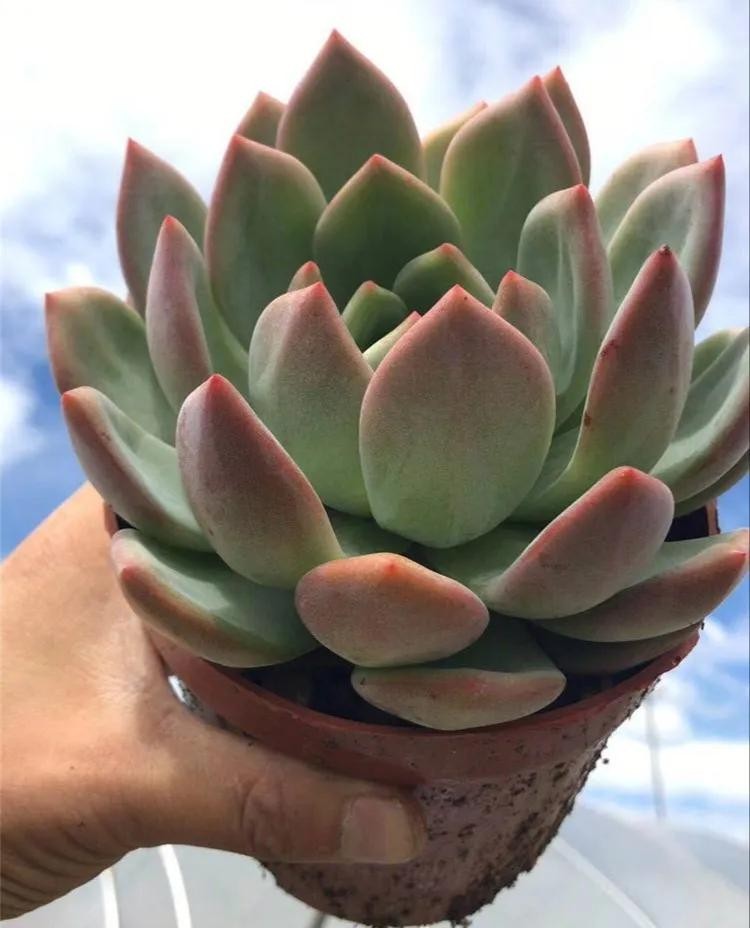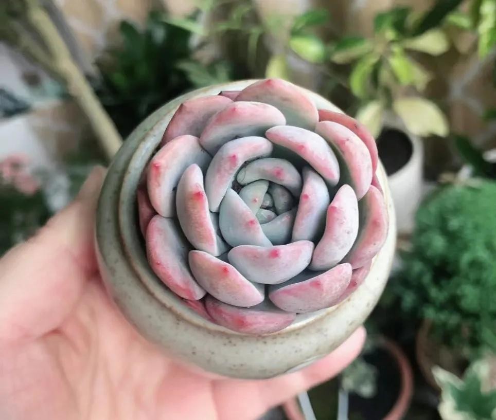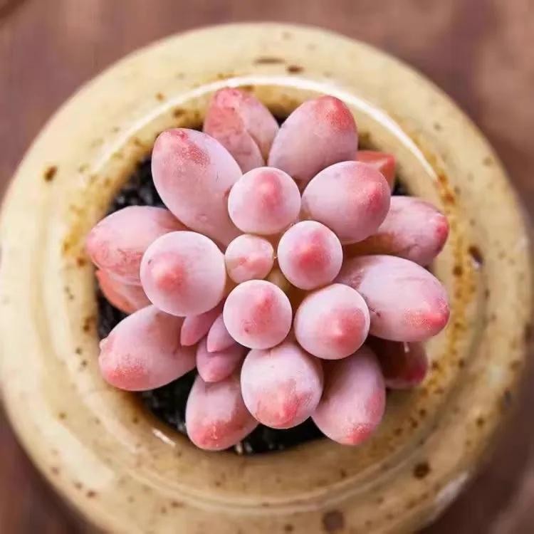 桃美人,与桃蛋长得极为相似,但还是有些差异。是由月美人和稻田姬杂交而来的园艺品种。桃美人叶片上会长一层白色的粉,相较于桃蛋的透亮,桃美人有一种哑光的质感。