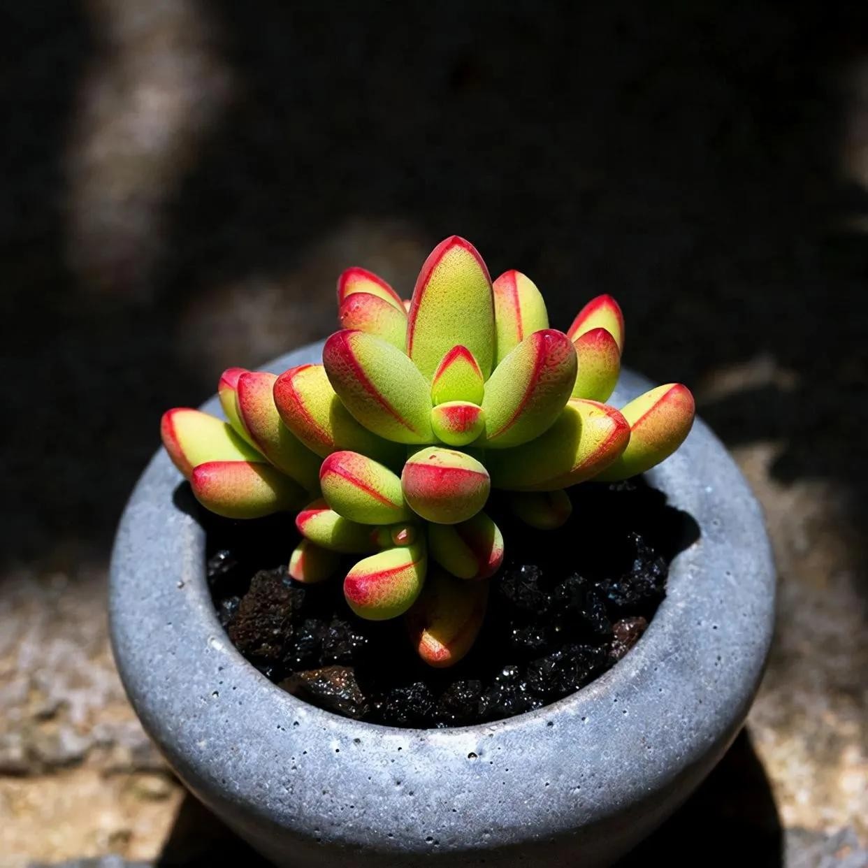 姬胧月是一款很经典的多肉品种,日照充足时叶色为朱红带褐色,叶呈瓜子型,叶末较尖,开黄色小花,星状。