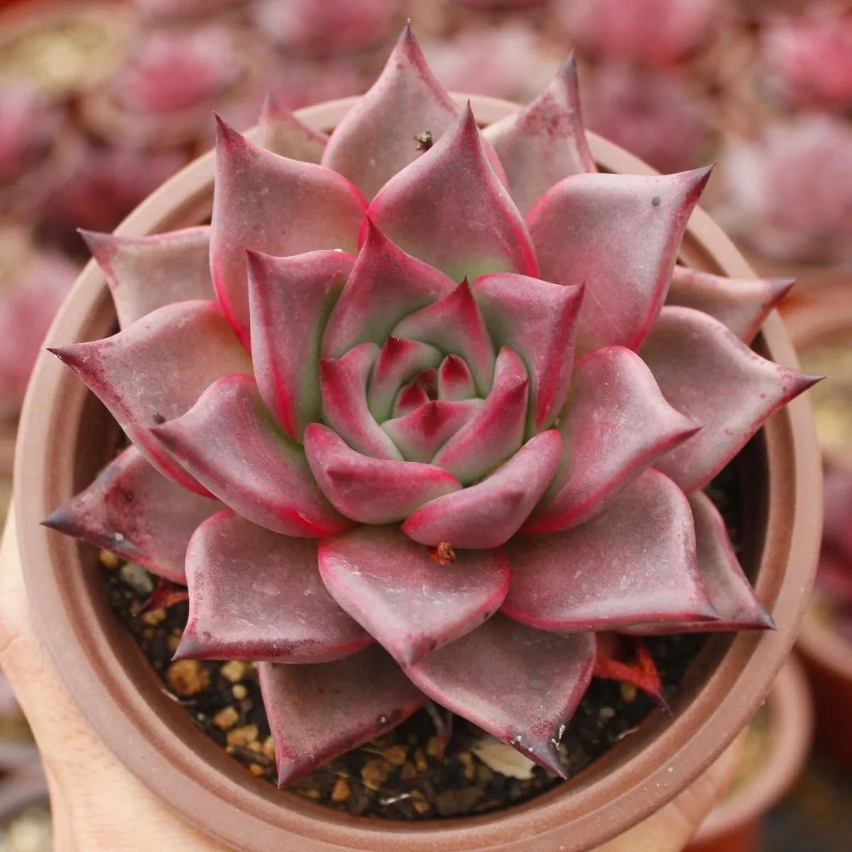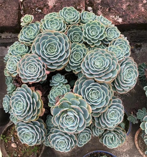 多肉吉娃娃,植株小型,无茎的莲座叶盘非常紧凑。卵形叶较厚,带小尖,蓝绿色被浓厚的白粉,叶缘为美丽的深粉红色。