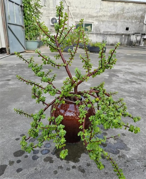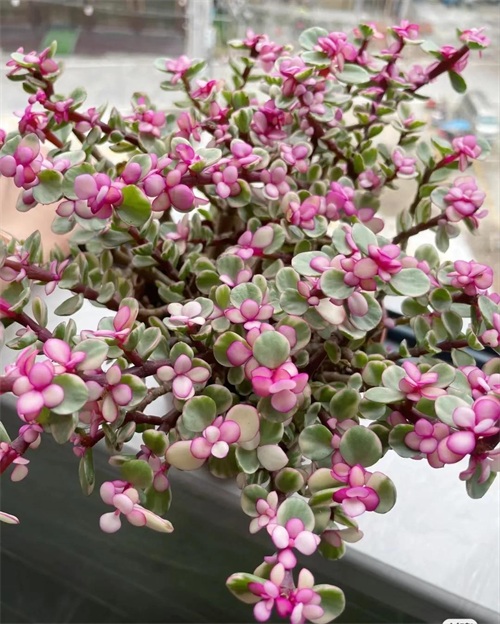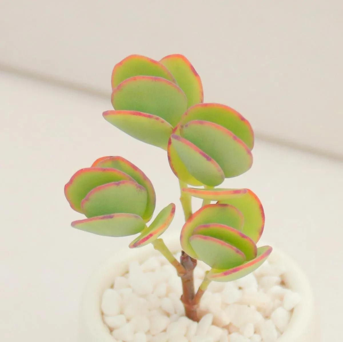 钱串的叶子交叉而生,茎就是叶,叶就是茎,具备非常高的观赏价值,而且可根据环境变化颜色的叶子又为其增添了一份瑰丽。