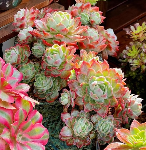 40.晚霞它的叶片边缘呈现细褶状,就像舞裙的边,叶面履了一层薄白霜,显得更美丽了。如果给它光照充足和大温差的环境,晚霞之舞的叶片会变为漂亮的粉红色和紫红色,很迷人。