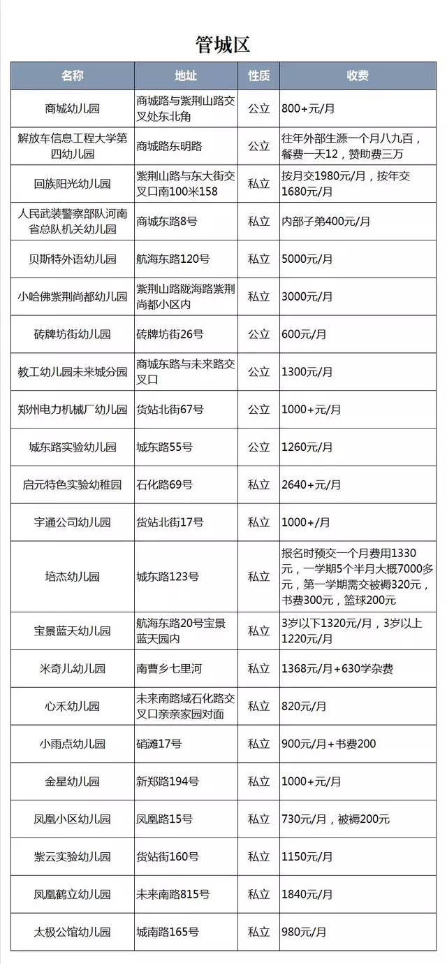 商城幼儿园:管城区商城幼儿园是一所隶属于管城区教委的公立省级示范性幼儿园,中班大班各4个,小班3个,每班30人。幼儿园面积比较大,活动空间宽,但是必须满3岁半入园。师资稳定,为了进一步加强教师专业技能训练,给教师搭建一个展现自我、相互交流的平台。