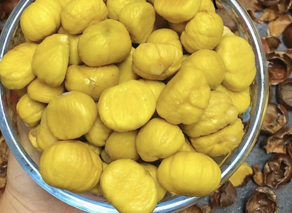 经过这两个简单的步骤,现在我们就可以开始剥皮了。取出一颗板栗,握在手中,用力压在板栗的两端,然后用手指在中间一点用力推出。好像剥开一颗糖果的包装纸一样。当板栗的皮被剥开时,内部的香甜和糯度会弥漫开来,令人垂涎欲滴。