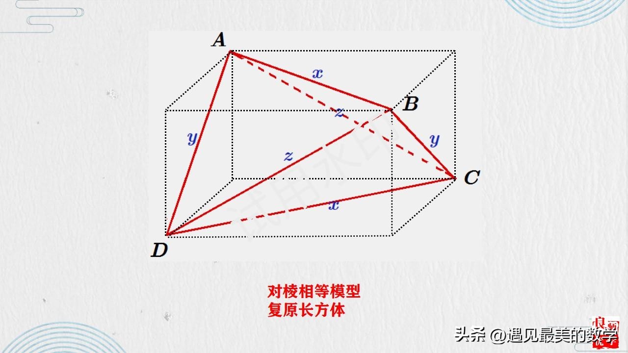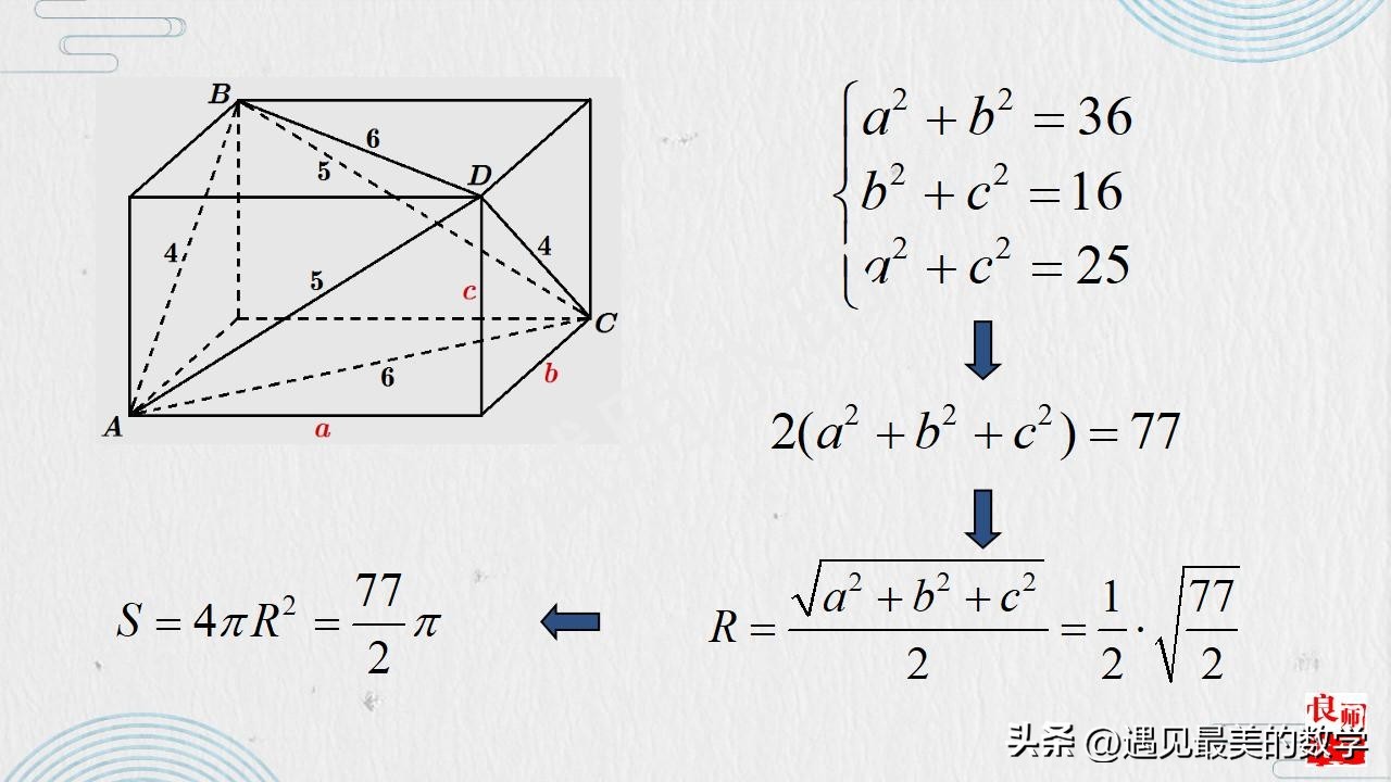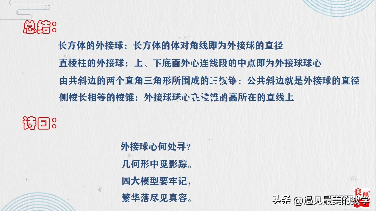 摘要:在确定空间几何体外接球球心的位置时,其一般途径是从平面图形的外接圆拓展到空间几何体的外接球。特别要注意结合特殊几何体的结构特征来灵活确定外接球球心的位置,比如长方体、直棱柱、棱锥等。从一些规则或不规则的图形中梳理有规则的求解思路,形成有法可依、有规可循的方法体系。